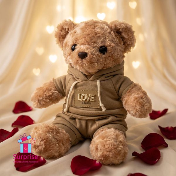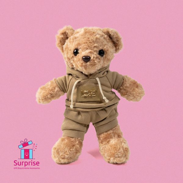 دبدوب فرو لطيف مرتدي هودي وشورت أنيق، مثالي للعناق أو للديكور أو كهدية.
