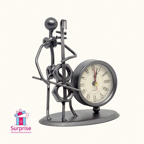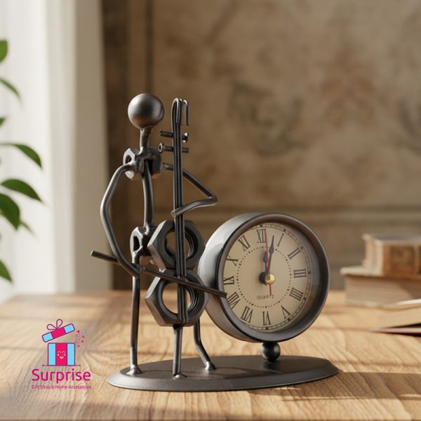 ساعة مكتبية مصنوعة يدويًا من الحديد، تتميز بتصميم موسيقي لعازف التشيلو. طراز كلاسيكي قديم مصنوعة من قطع معدنية معاد تدويرها، وتعمل كساعة كوارتز عملية وإكسسوار منزلي مميز.