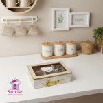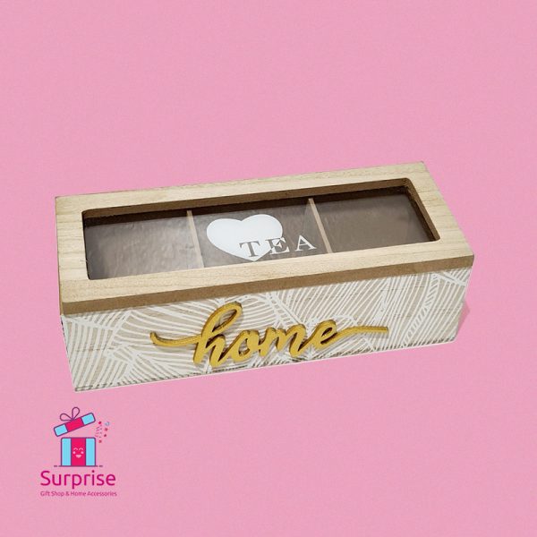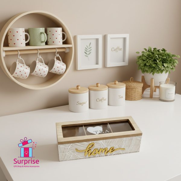 نظّم أكياس الشاي المفضلة لديك بأناقة مع هذا الصندوق الخشبي العصري المكوّن من ثلاث خانات. يتميز بغطاء شفاف وتصميم جذاب يحمل كلمة “Home”، مما يجعله مثالياً لأي مطبخ أو ركن قهوة.
