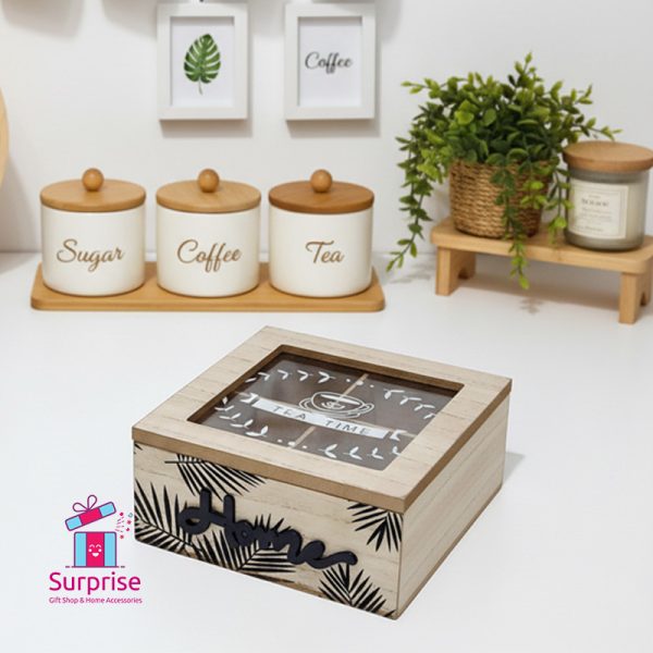 نظّم أكياس الشاي المفضلة لديك بأناقة مع هذا الصندوق الخشبي العصري المكوّن من ست خانات. يتميز بغطاء شفاف وتصميم جذاب يحمل كلمة “Home”، مما يجعله مثالياً لأي مطبخ أو ركن قهوة.