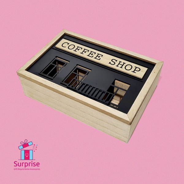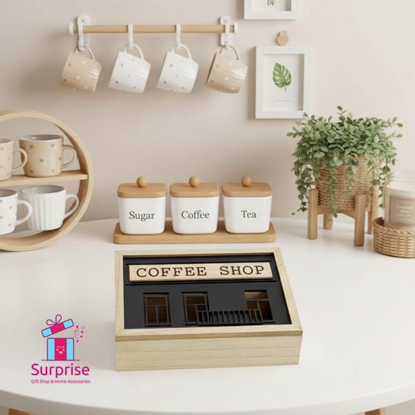 صندوق شاي خشبي، منظم للشاي والقهوة، تخزين للمطبخ، ديكور منزلي، متجر هدايا، حامل أكياس الشاي، صندوق ديكوري، متجر سبرايز جفت شوب.