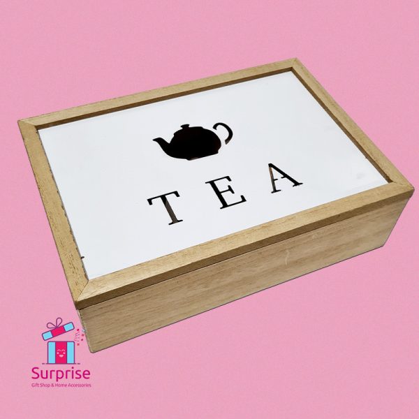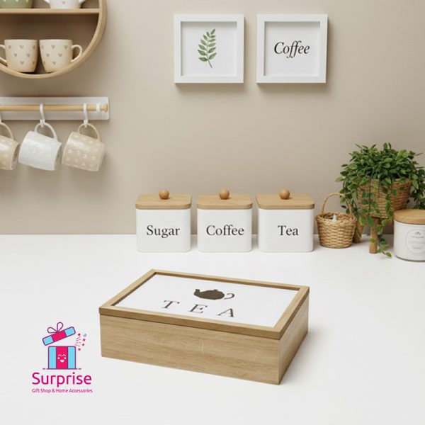 صندوق شاي خشبي، منظم للشاي والقهوة، تخزين للمطبخ، ديكور منزلي، متجر هدايا، حامل أكياس الشاي، صندوق ديكوري، متجر سبرايز جفت شوب.