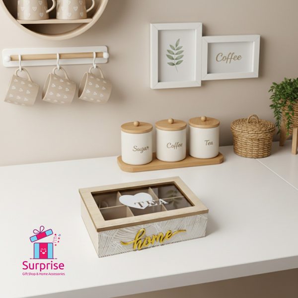نظّم أكياس الشاي المفضلة لديك بأناقة مع هذا الصندوق الخشبي العصري المكوّن من ست خانات. يتميز بغطاء شفاف وتصميم جذاب يحمل كلمة “Home”، مما يجعله مثالياً لأي مطبخ أو ركن قهوة.