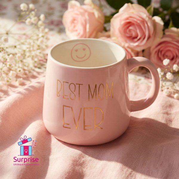 كوب بورسلين باللون الوردي مزين بعبارة “BEST MOM EVER” باللون الذهبي مع وجه مبتسم داخل الكوب. هدية جميلة ومميزة، مثالية لـ عيد الأم أو للتعبير عن التقدير كل يوم.