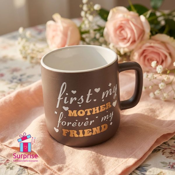 كوب بورسلين بني أنيق مزين بعبارة “Forever Friend Mom” باللون الذهبي مع قلوب زخرفية جميلة. هدية راقية ومعبّرة، مثالية لـ عيد الأم أو أعياد الميلاد أو للتعبير عن التقدير كل يوم.