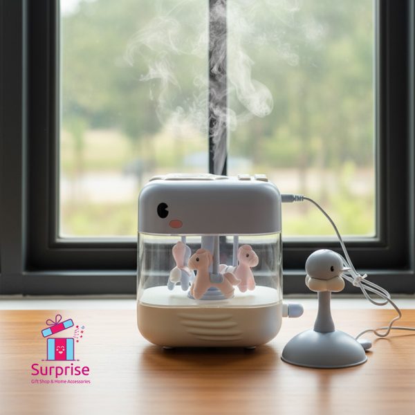 أضف لمسة من السحر والهدوء إلى مساحتك مع هذا الموزع الأنيق الذي يتميز بتصميم على شكل حصان وفتاة داخل خزان ماء شفاف. تمنحك الإضاءة الناعمة والموسيقى الهادئة أجواءً ساحرة، بينما يضيف جهاز الترطيب راحة لأي غرفة.