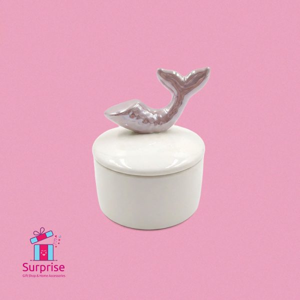 Elevate your vanity with this elegant ceramic trinket jar featuring a stunning iridescent whale tail handle. Perfectly designed to keep your precious jewelry safe while adding a touch of nautical charm to your home decor.