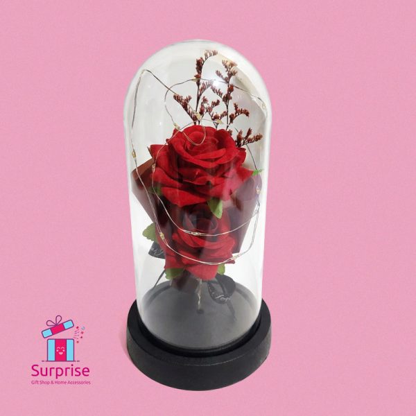 • Material: Artificial Rose, Glass Dome, Plastic Base, LED Lights