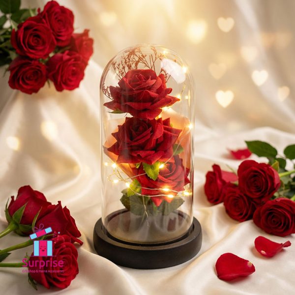 - Material: Artificial Rose, Glass Dome, Plastic Base, LED Lights