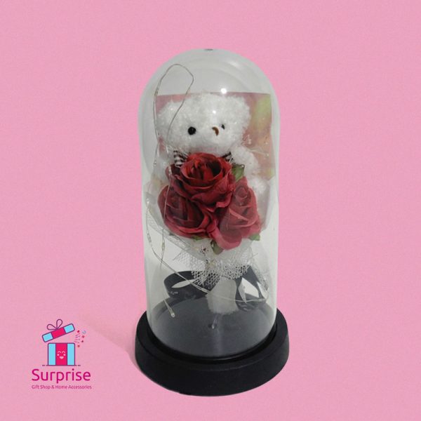 A beautifully crafted artificial flower and a Teddy Bear Figurine enclosed within a clear glass crystal, softly illuminated by warm LED lights. This elegant, maintenance-free decorative piece adds a refined touch to any space and makes a thoughtful gift for a variety of occasions.