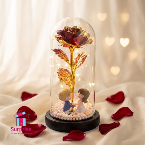 A beautifully crafted artificial flower and a cute couple Figurine enclosed within a clear glass crystal, softly illuminated by warm LED lights. This elegant, maintenance-free decorative piece adds a refined touch to any space and makes a thoughtful gift for a variety of occasions.
