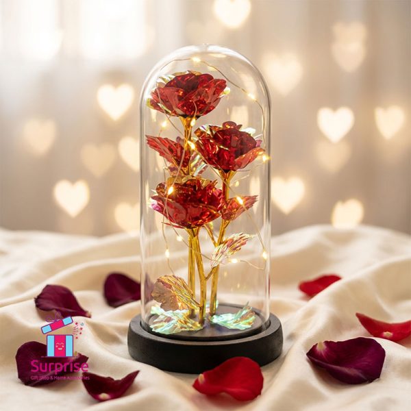- Material: Artificial Rose, Glass Dome, Plastic Base, LED Lights