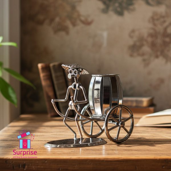 Elevate your desk with this unique, handcrafted metal rickshaw pen holder. A perfect blend of vintage charm and practical office organization, it’s an eye-catching showpiece and a thoughtful gift idea.