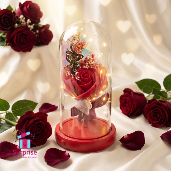 - Material: Artificial Rose, Glass Dome, Plastic Base, LED Lights