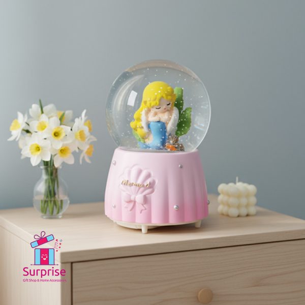A enchanting mermaid snow globe with automatic glitter, music, and vibrant LED lights.