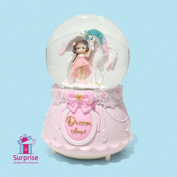 A enchanting pink musical snow globe featuring an angel and unicorn, perfect for sparking imagination. This delightful decorative piece is an ideal gift for girls and fantasy lovers of all ages.