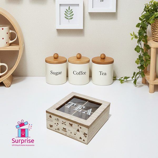 wooden tea box, tea organizer, kitchen storage, home decor, gift shop, tea bag holder, countertop organizer, decorative box, three compartments, Surprise Gift Shop